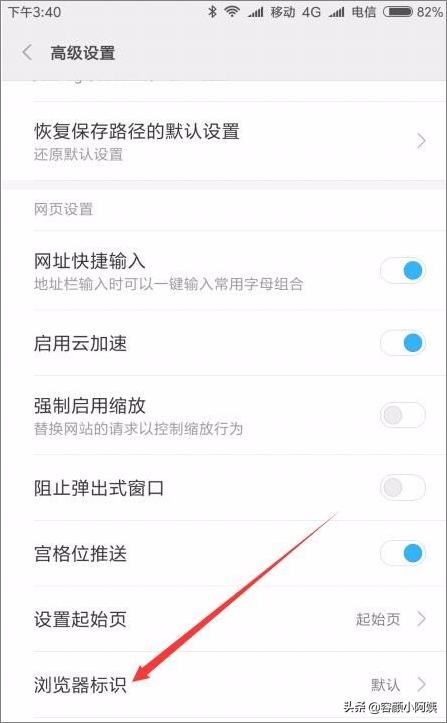 2、在打开的高级设置页面中,点击“浏览器标识”菜单项。