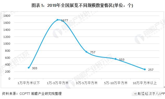 从中国境内举办的所有规模展览来看,2019年中小规模展览数量居多,中大规模展览数量实现稳步增长。如下图所示,1万-3万平方米规模展览共举办1677个,占全部规模展览数量的47.3%;3万-5万平方米规模展览共举办757个,占全部规模展览数量的21.3%;1万平方米以下及10万平方米以上规模展览数量均偏少,分布为303个及257个。